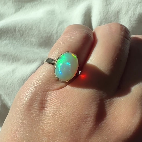 Stones: Natural opal measures 13mm x 10mm (estimated at 5.65 carats). The opal is in very good condition and free of cracks or chips.