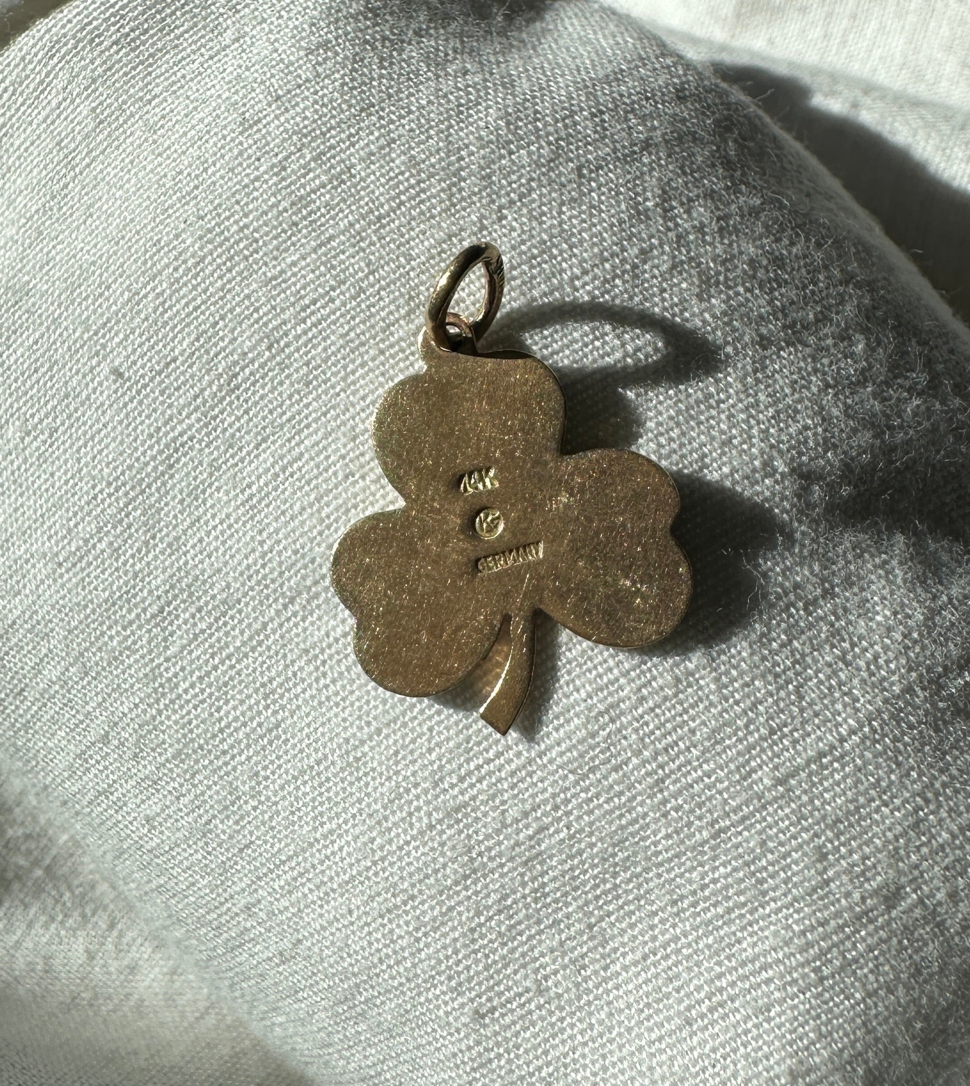 Vintage German Enamel Green Clover Pendant 14k Yellow Gold Lucky Charm Estate Jewelry